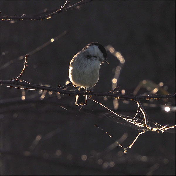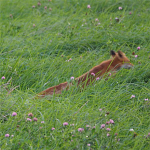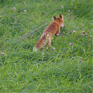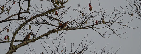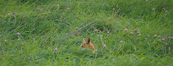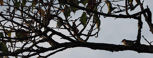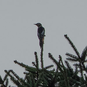 朝6時の気温は16℃。小鳥やカッコウ、ヤマバト、ウグイス、キジなどの声がする中、曇りがちの空ではシギがディスプレイフライトをしている音が響いていました。自分の視力では姿を見つけられず、カメラで探して撮ってみました。 |