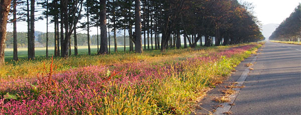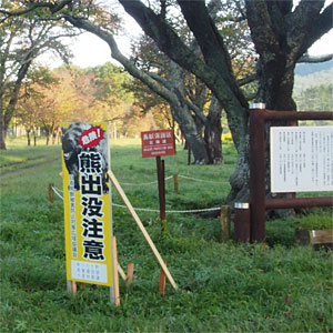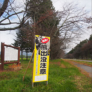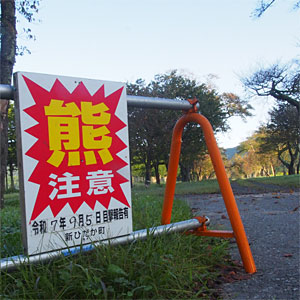 午前5時半の気温は17℃。空気や虫の声が秋の訪れを知らせているような朝。 二十間道路の花のトンネルで昨日、熊の目撃情報があったとの看板がありました。くれぐれも注意しましょう。 |