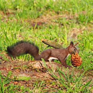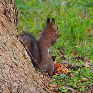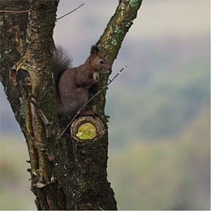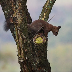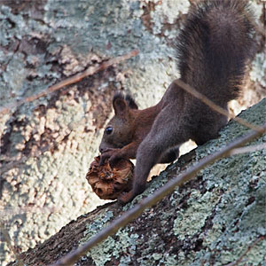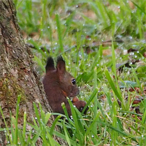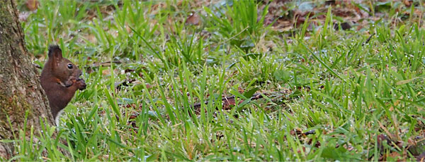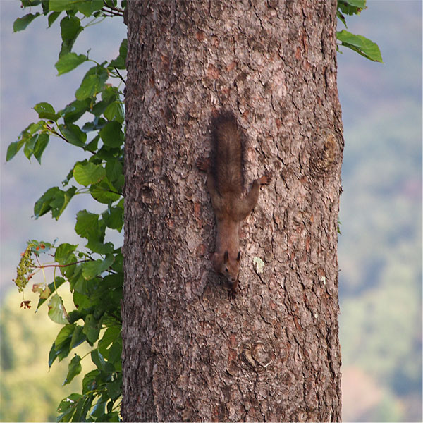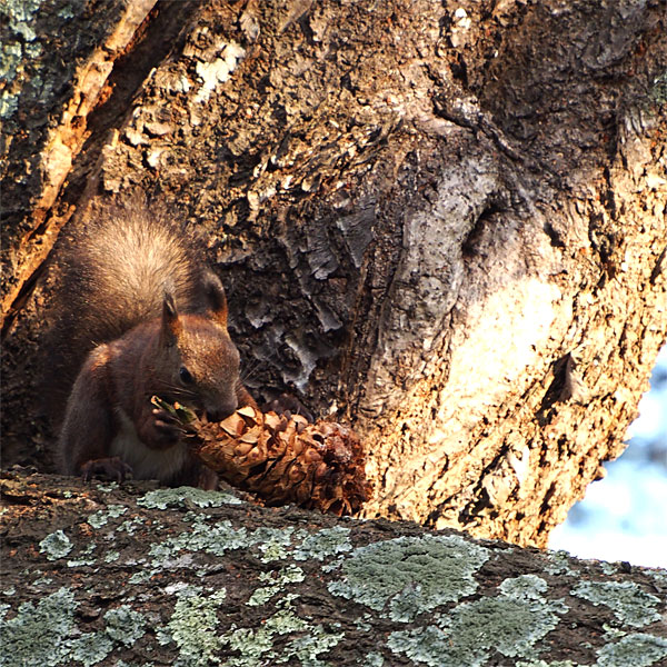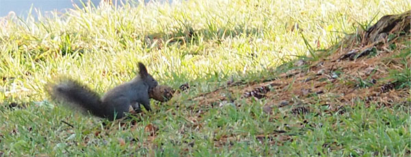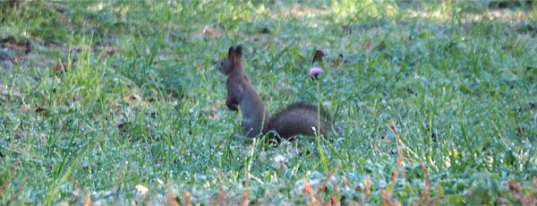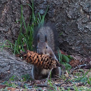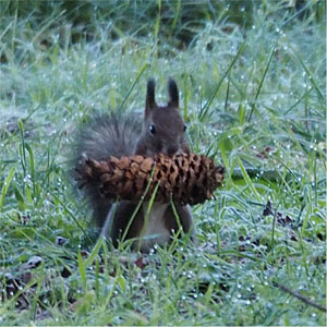 | 朝6時30分ころの気温は12℃。天気の週間予報では稚内や旭川では雨と一緒に雪のマークがついています。一気に寒くなっていきそう…。今朝はクマゲラとリスを写真に。 | |