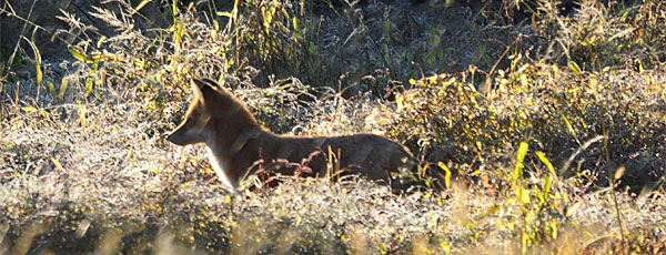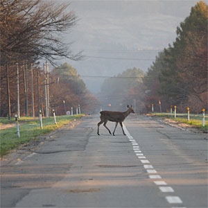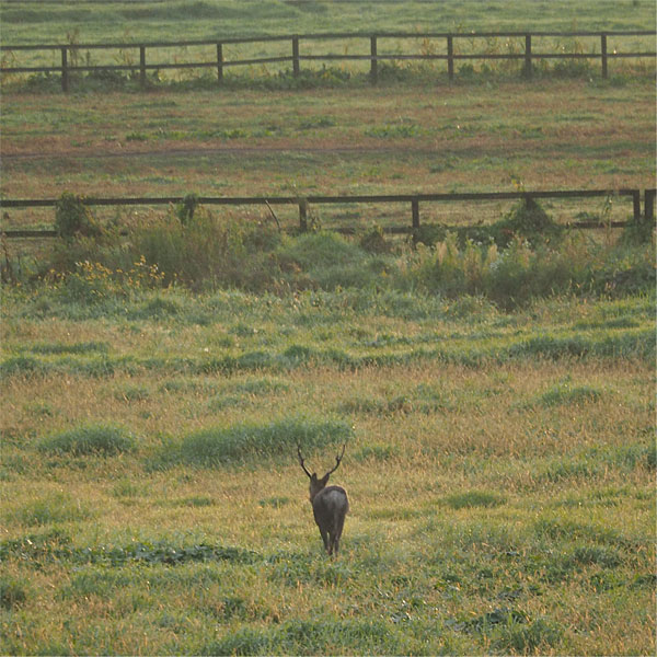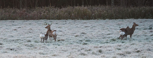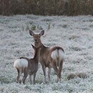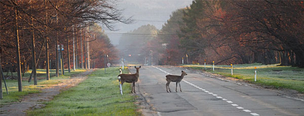 | 朝7時30分頃の気温は-3℃。牡鹿の群れが二十間道路を横切って行くのを写真に。 | |